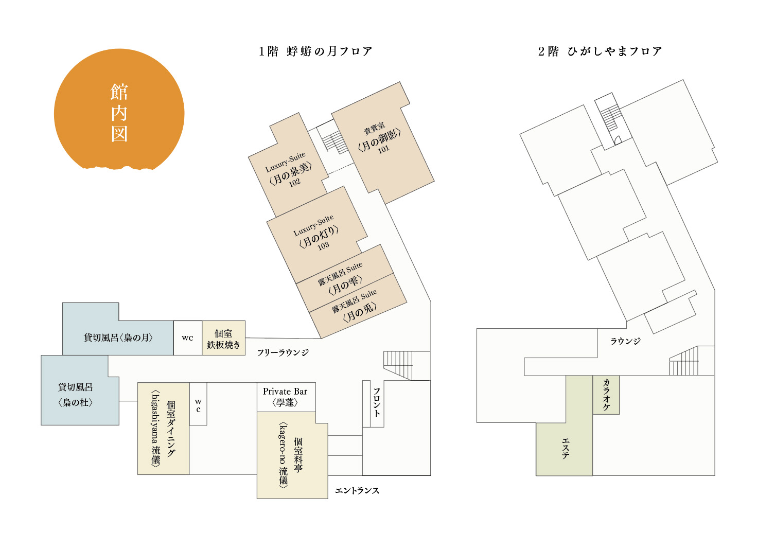 館内施設 : 貸切露天風呂〈梟(あうる)の杜〉〈梟(あうる)の月〉、個室料亭〈蜉蝣の流儀〉、個室ダイニング〈月の流儀〉、個室鉄板焼き〈匠の流儀〉、フロント、ラウンジ、プライベートバー〈學蓬〉、エステルーム〈瑠璃光〉、セレクトショップ〈想月庵〉、秘密の扉