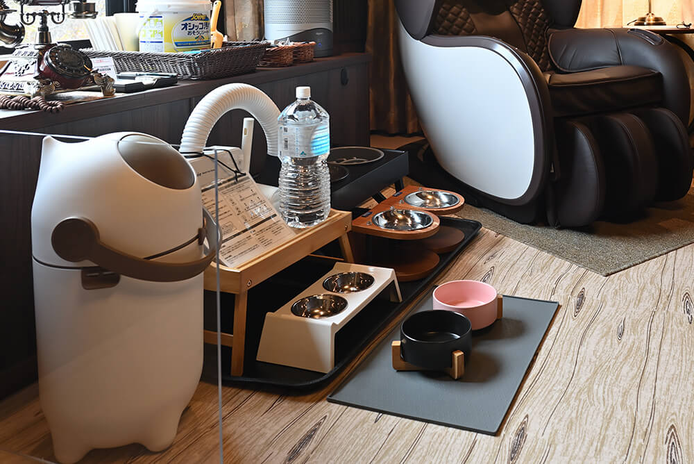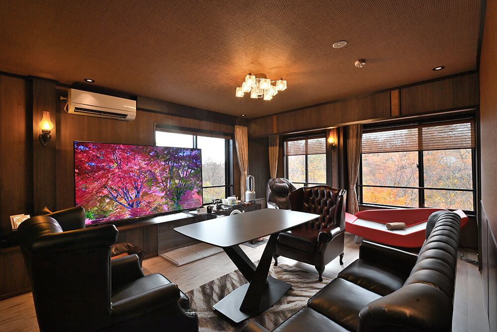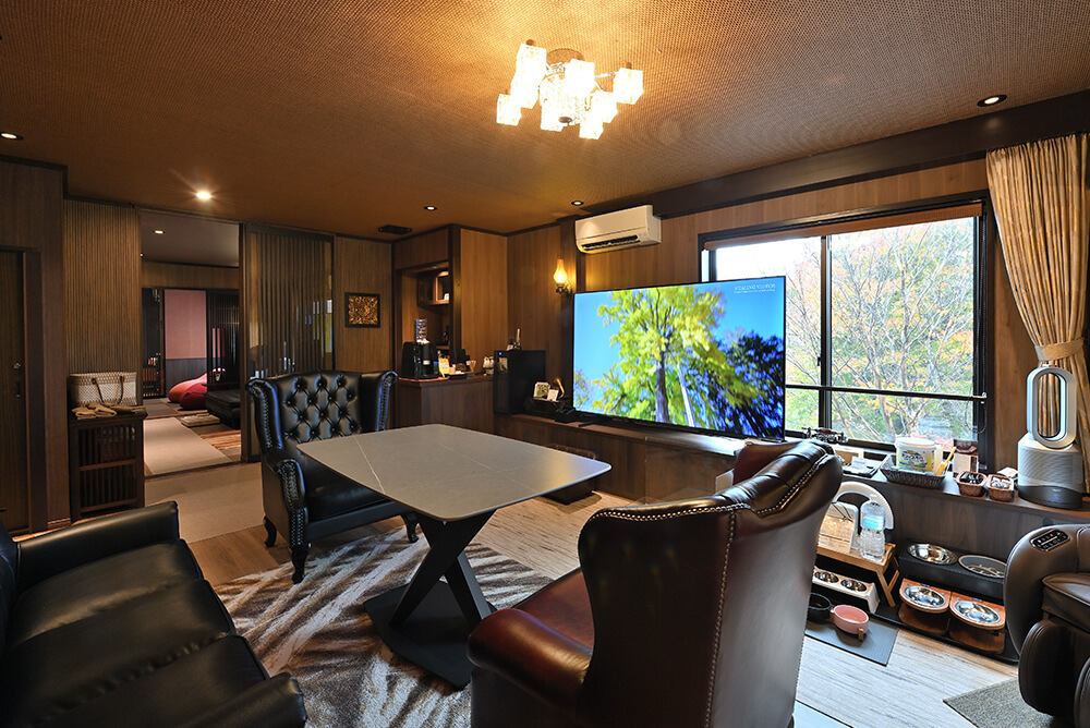 2F 月のフロア/個室で鉄板焼きを堪能する贅を極めた至上の空間 厳選素材の鉄板焼きを個室で、心ゆくまで楽しんでいただける当宿最上位となる貴賓室です。源泉の湯を掛け流しで注ぐ展望露天風呂は、窓から望む森と一体となるインフィニティバス。3名様でも同時に入浴いただける大型サイズの湯舟には、浴室テレビも完備しています。大型テレビとレザーソファーを備えたリビングでは、角部屋の大きな明るい窓から季節の森の景色が広がります。 可動式のパーテーションで区切ることで、こじんまりとした落ち着きも味わっていただけるモダン和室。映像を大迫力で楽しんでいただける、75インチの大型TVを備えたシアタールーム。100年前のステンドグラスをデザインアクセントにした、アンティークムードに溢れる重厚なダイニングルームなど。尽きないほどの意匠を凝らした特別なお部屋は、【ペットちゃん】とも過ごしていただける贅を極めた至上の空間です。 プレミアムビュースイート〈天空の月〉の場所はこちら