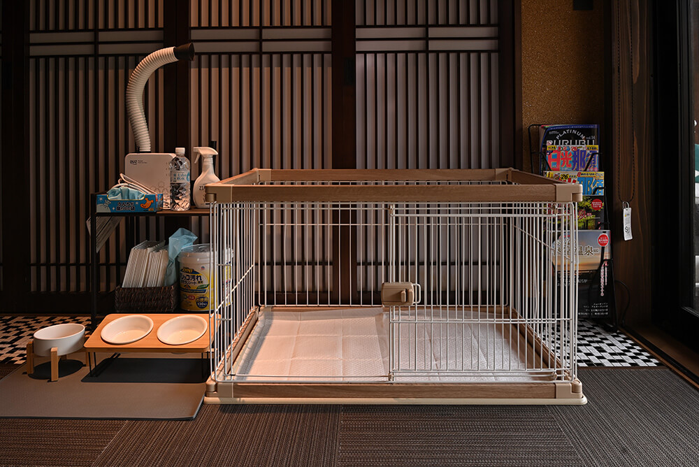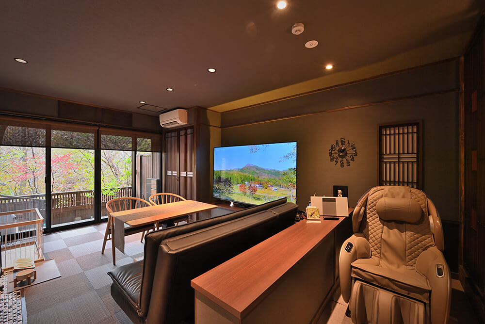 1F 蜉蝣フロア/露天風呂付ハイランドスイート 貴賓室 【ペットちゃんと過ごせる】贅を極めた上質な空間、チェックインは専用駐車場より直接お部屋へ。森林を眺めるウッドデッキと開放的な専用露天風呂が、贅沢な時間を生み出します。源泉の湯を注ぐ湯舟には、温泉効果を高めるブロアバスと浴室テレビも完備。極上のバスタイムをいつでもご堪能ください。大型テレビとレザーソファを備えたリビングには、ペット専用ケージも常設。癒しのマッサージチェアとツインベッドとともに、優雅な時間を贅沢にお過ごしいただける特別なお部屋です。 ハイランドスイート貴賓室〈月の御影〉の場所はこちら