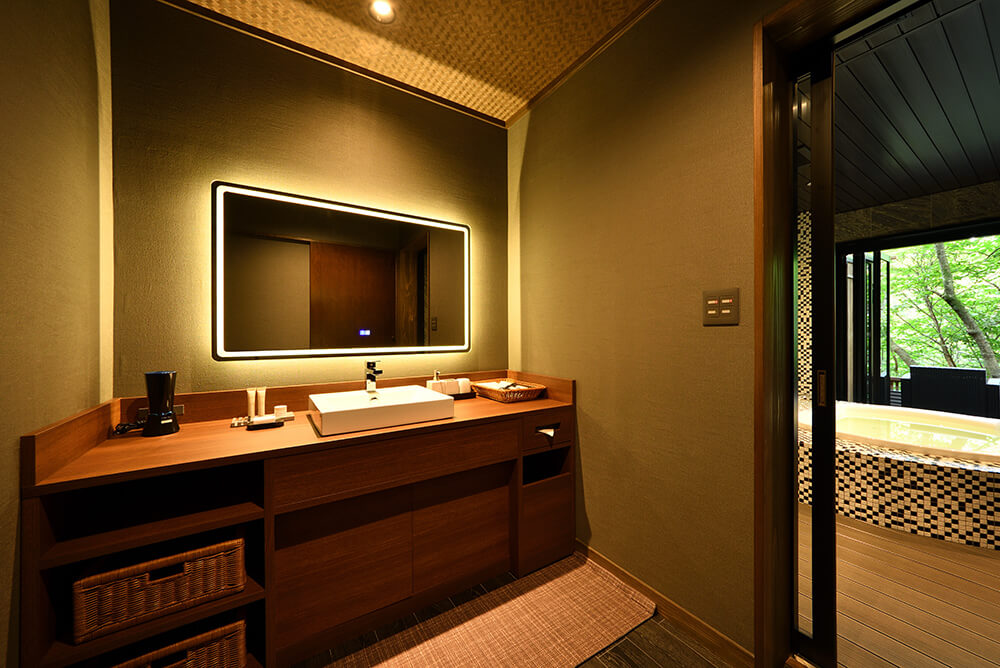 館内施設 : 貸切露天風呂〈梟(あうる)の杜〉〈梟(あうる)の月〉、個室料亭〈蜉蝣の流儀〉、個室ダイニング〈月の流儀〉、個室鉄板焼き〈匠の流儀〉、フロント、ラウンジ、プライベートバー〈學蓬〉、エステルーム〈瑠璃光〉、セレクトショップ〈想月庵〉、秘密の扉