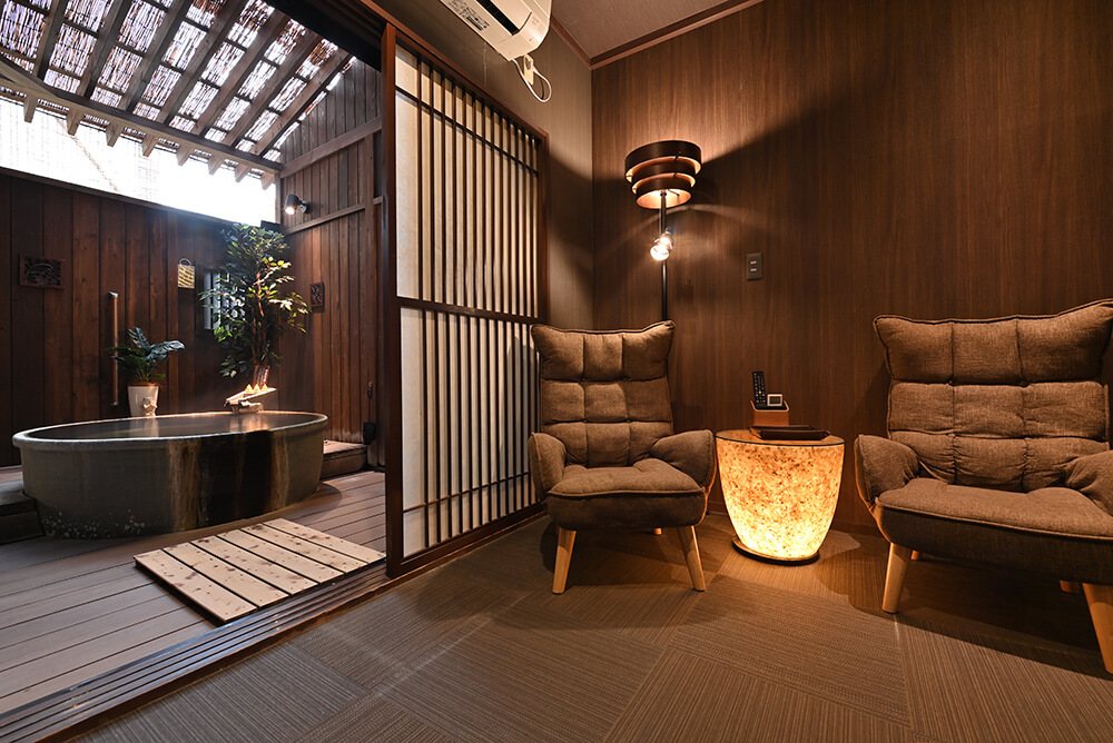 1F 蜉蝣フロア/露露天風呂付スタンダードツイン 上質な眠りへと誘うツインベッドを設えた、お二人様専用の少しコンパクトな特別室です。信楽焼の湯舟を持つ専用の露天風呂では、掛け流しで注ぐ源泉の湯を滞在中いつでもご堪能いただけます。お部屋に備わる挽きたて珈琲が贅沢なネスプレッソマシン、冷蔵庫ミニバー(無料)も自由に楽しんでいただける【特別な人と過ごして欲しい】お部屋です。 露天風呂付スタンダードツイン〈月の兎〉の場所はこちら